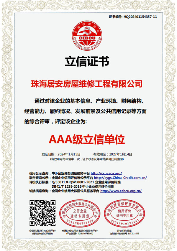 珠海居安房屋維修工程有限公司成立于2020年,是一家專注房屋維修的公司。我們擁有各類型專業人才,業務包括老舊建筑翻新改造、外墻空鼓修復、防水幕墻養護、外墻預置構件拆除更換、供排水管網改造、墻面翻新、鋼制結構建筑構建及折除,外墻清洗及裝修裝飾。 公司自成立以來,始終堅持以人為本、誠信敬業的經營原則,與多家單位達成固定維修、養護清洗協儀,業務遍及廣州、東莞、中山、珠海等多個周邊城市。專業化團隊尤其在墻面及窗邊防水工程業內知名。…… >>> 更多內容 |